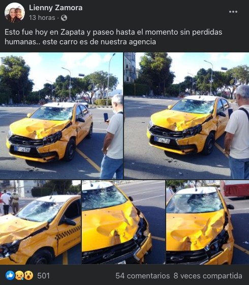 «Yo trasladé a la mujer para el Calixto García, unos cuantos carros mirando a la señora en el piso y ninguno la montaba, tuve que gritarles a los policías para que la subieran en mi carro», escribió una persona el grupo de Facebook «ACCIDENTES BUSES & CAMIONES por más experiencia y menos víctimas», donde se compartieron imágenes del taxi.