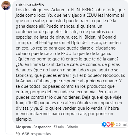 «Yo, que he viajado a EEUU les informo al que no lo sabe, que usted puede traer lo que le dé la gana desde allí. Puedo mandar, si quisiera, un contenedor de paquetes de café, o de pomitos con especias, de latas de pintura, etc. Ni Biden, ni Donald Trump, ni el Pentágono, ni el Departamento del Tesoro, se meten en eso. Lo repito para que quede claro: el ciudadano cubano puede sacar de EEUU lo que le dé la gana», escribió Silva, en un comentario que ha generado miles de reacciones y cientos de comentarios de los internautas, en la gran mayoría apoyando sus palabras.
