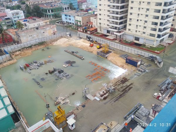 Una de las fotografías es bastante ilustrativa, mostrando totalmente inundado, como una piscina, el área donde se está preparando la cimentación de una nuevo edificio a solo metros del Malecón.