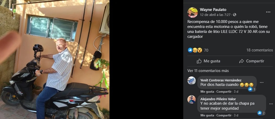 «Recompensa de 10,000 pesos a quien me encuentre esta motorina o a quien la robó, tiene una batería de litio LILE LLDC 72 V 30 AR con su cargador», detalló el cubano Wayne Paulato en redes sociales.