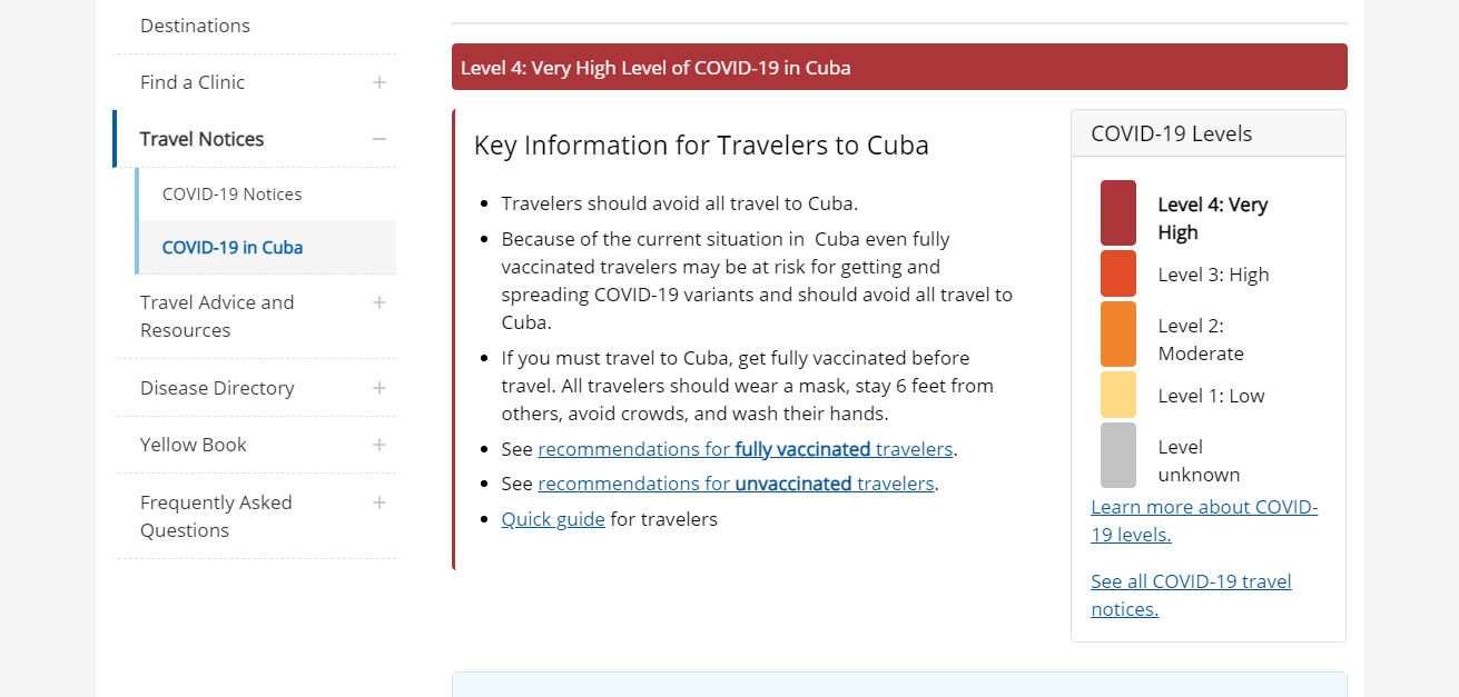 La medida fue actualizada este martes en el sitio web del Departamento de Estado estadounidense. Ahí se detalla que el Centro para el Control y la Prevención de Enfermedades (CDC, por sus siglas en inglés) subió la alerta sanitaria a categoría cuatro para Cuba, que es “no viajar”.