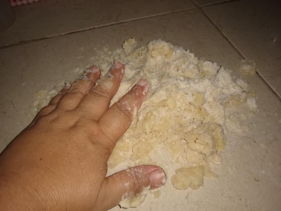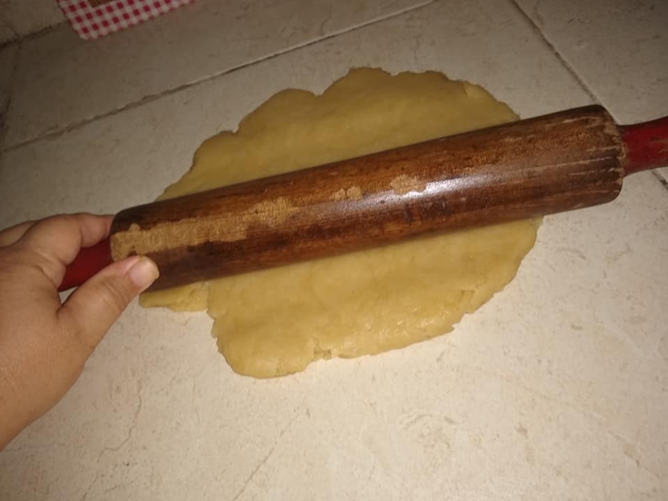 Paso 5 – Saca la masa después de los 30 minutos y ponla en una superficie donde puedas ir aplanándola con el rodillo…(o una botella de cristal, de las ron puede servir o un palo en forma de cilindro, los de escoba después lavado, los puedes usar para ese menester).