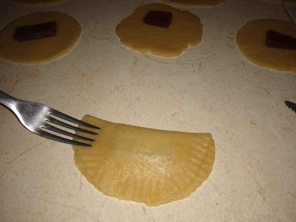 Paso 8 – Doblamos a la mitad. Unimos las dos masas y con un tenedor les hacemos este artístico dibujo. También debes pinchar la superficie de la empanada para que no se inflen demasiado.