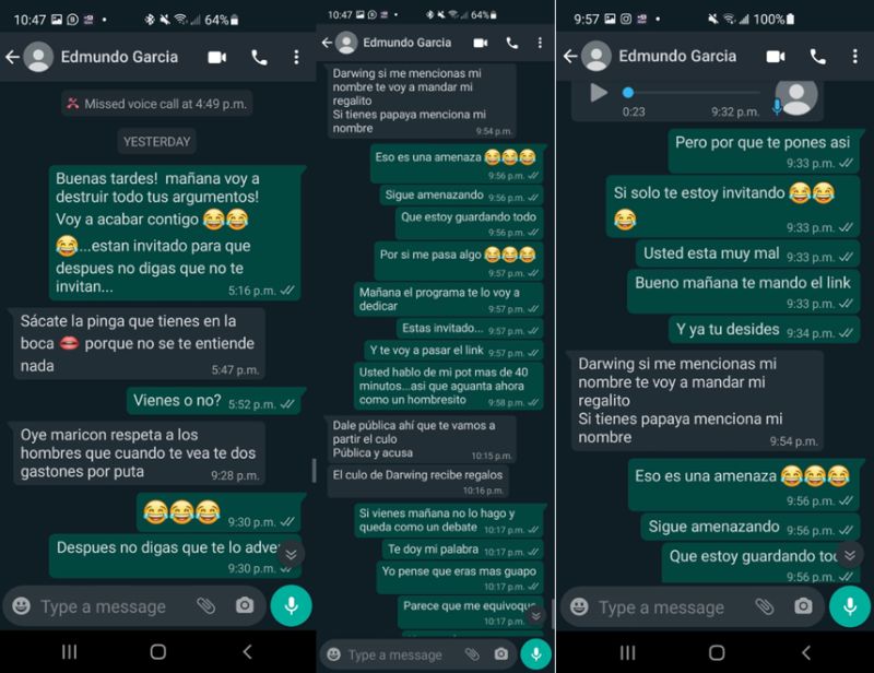 “Oye, mari…, respeta a los hombres”, le dice en un mensaje de texto, mientras que a través de audios continúa con fuertes ofensas. “El día que te encuentre te voy a meter cuatro gaznatones, si no es que alguien por ahí te hace el favor, cuidado, cuidado (…); te voy a mandar mi regalito”, le espeta García.
