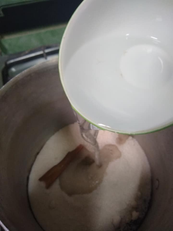 Paso 2 – Lo primero es hacer un almíbar ligero, echa el azúcar en un jarro o recipiente alto y amplio pues el dulce va a crecer y puede salirse del cazo. Agrega la ramita de canela, la cascarita de limón y el agua. Déjalo cocinar a fuego medio.