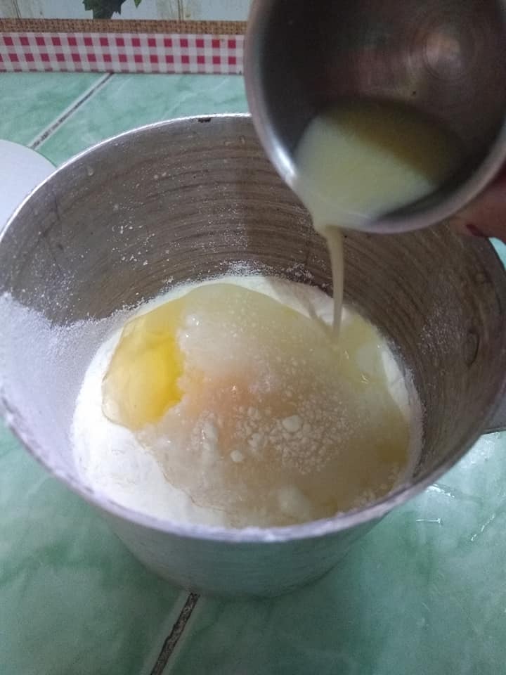 Paso 3 – Por otro lado, en un recipiente amplio o en otro jarro, echa la lata de leche en polvo, el huevo y la tacita de limón.