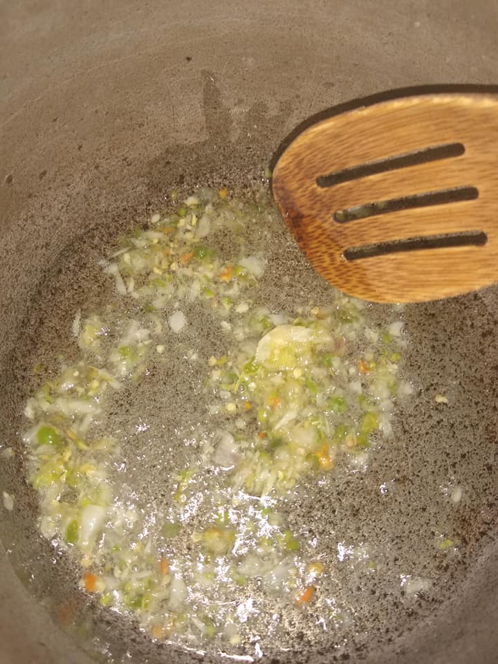 Paso 2 – Lo primero es poner a fuego medio un recipiente alto, echa el aceite y cuando esté caliente agrega la cucharada de todo sazón o en su defecto, ajo, ají y cebolla picado fino para elaborar un sofrito.