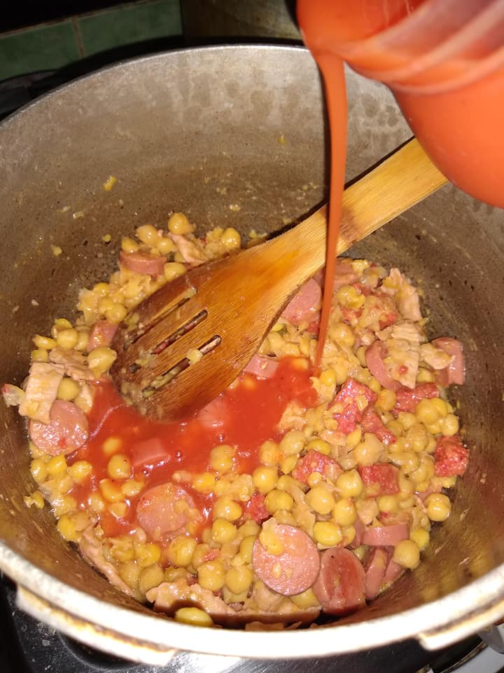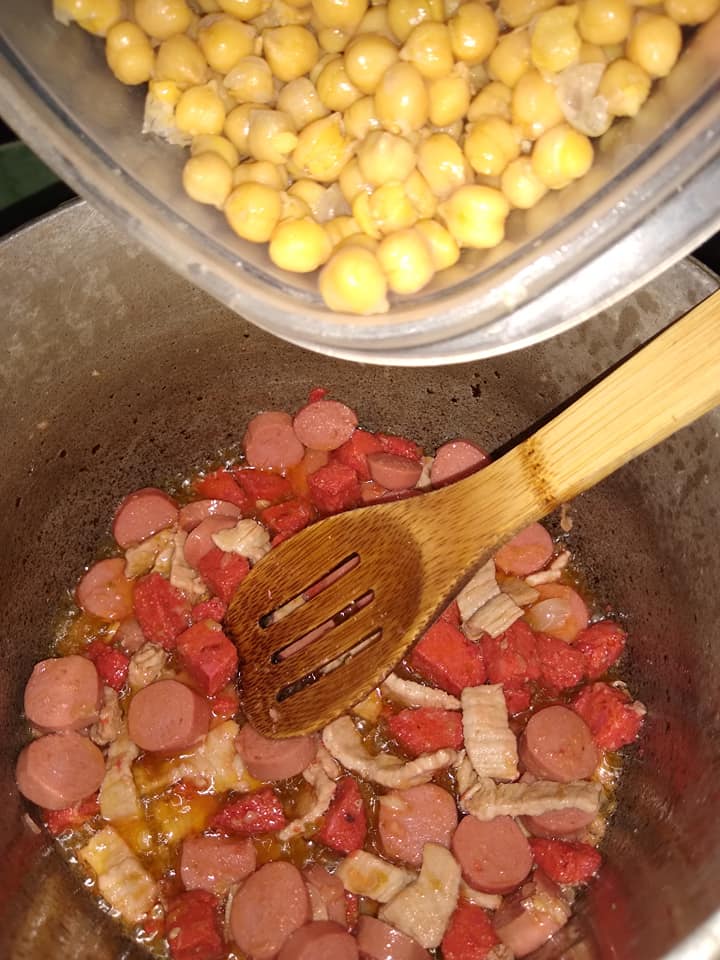 Paso 5 – Cuando todas las carnes están bien doraditas y soltaron su grasita, echa los garbanzos cocidos y escurridos. Revuelve nuevamente e integra todo el sabor.