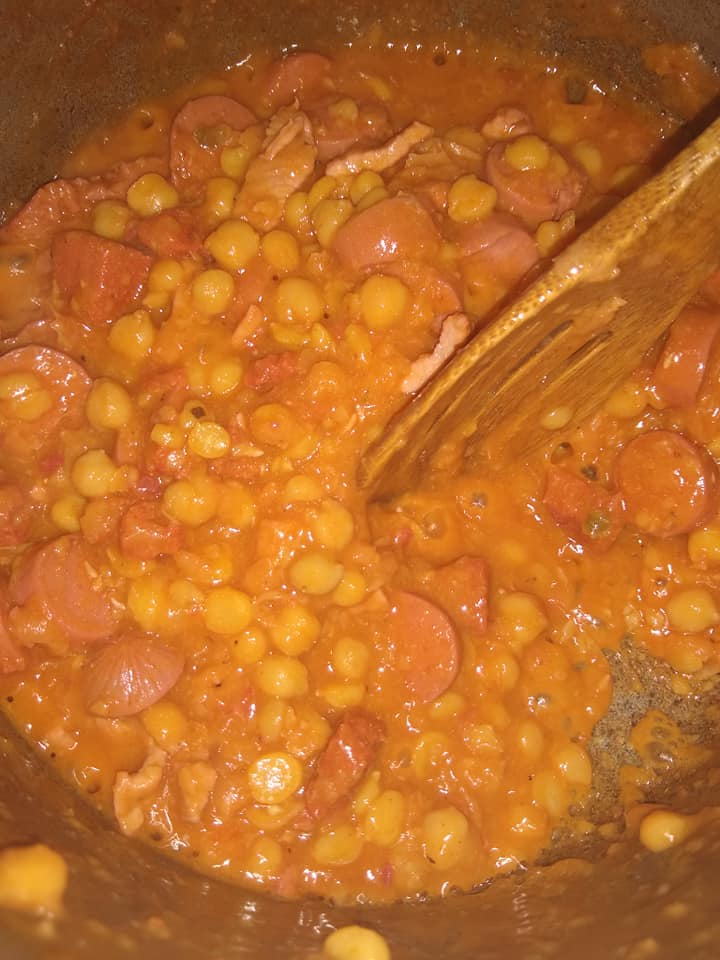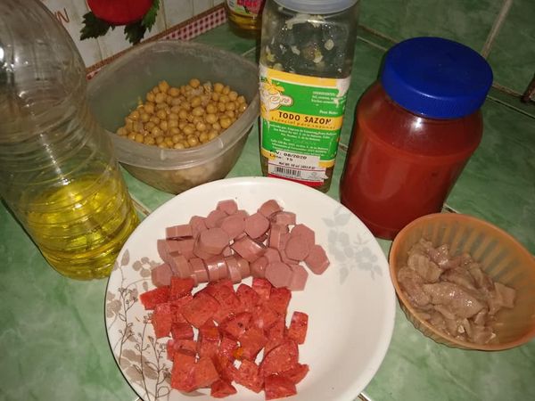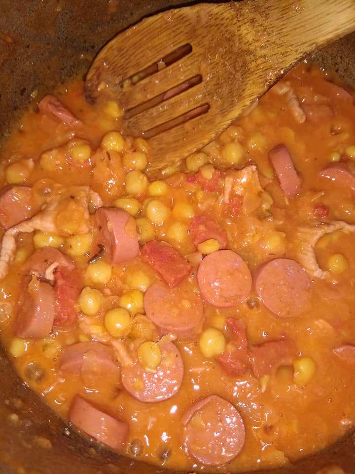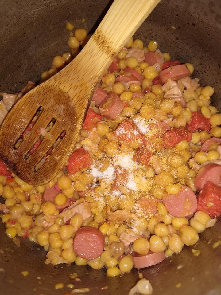 Paso 1 – Tenía como ingredientes: 3 salchichas, un pedazo de chorizo, dos bistecitos de cerdo salpimentados (todo troceado), dos tazas de garbanzos cocidos, 3 cucharadas de aceite, media taza de salsa de tomate casera, una cucharada de todo sazón casero (ajo, ají y cebollas picadas finamente y conservadas en aceite), sal al gusto y tu mezcla de especias favoritas (comino, orégano y curry en mi caso).