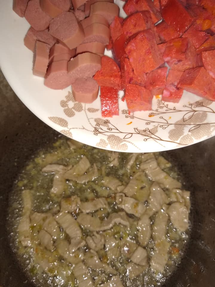 Paso 4 – Pasados 3 minutos, agrega el chorizo y las salchichas troceadas también. Revuélvelo todo y deja cocinar por 5 minutos mas.