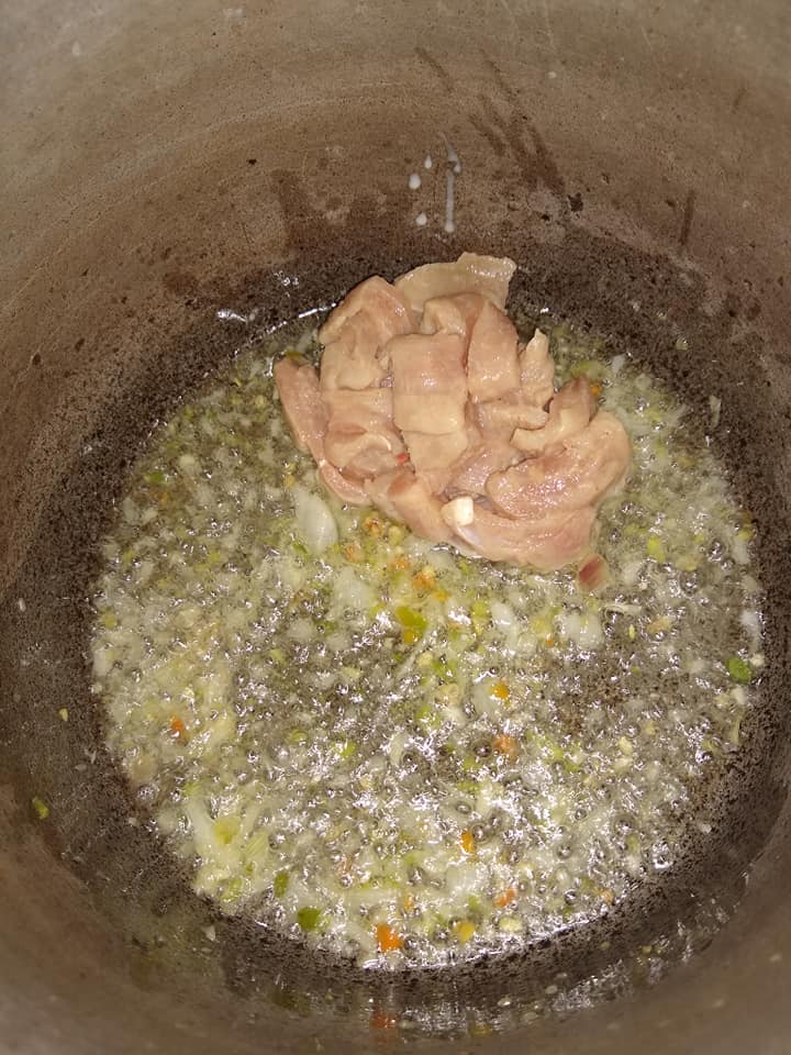 Paso 3 – Cuando los sazones han cambiado de color agrega la carne de cerdo condimentada con sal y pimienta, si no pues no pasa nada. Solo echas la carne y saltéala con los sazones.
