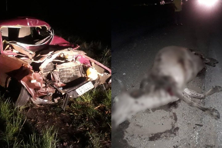 Un auto marca Lada completamente destrozado y una vaca muerta fue el saldo de un accidente ocurrido en la Autopista Nacional de Cuba, específicamente en el kilómetro 285.