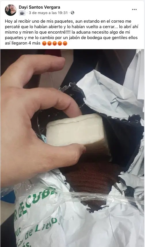 “Hoy, al recibir uno de mis paquetes, aun estando en el Correo, me percaté que lo habían abierto y lo habían vuelto a cerrar… lo abrí ahí mismo y ¡miren lo que encontré!!! la Aduana necesitó algo de mis paquetes y me lo cambió por un jabón de la bodega, que gentiles ellos, así llegaron 4 más”, así escribió esta usuaria en las redes, explicando lo sucedido.