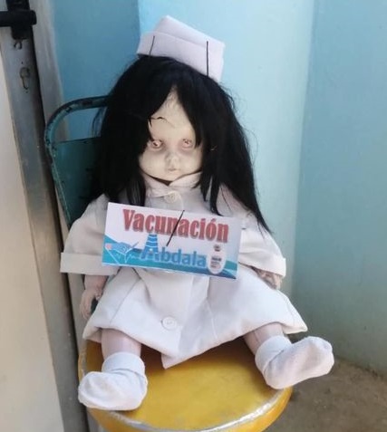 Resulta ser que la fotografía que se está utilizando en esa provincia como parte de la campaña de vacunación en uno de los centros habilitados para este fin, parece haber sido sacada de una película de terror.