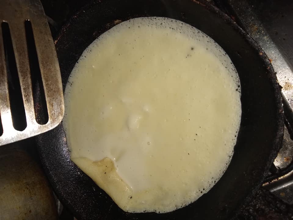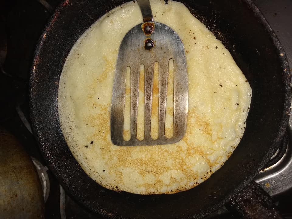 El ventiúnico huevito que tenía para hacerle a la niña, se me cayó de la parrilla del refrigerador y solo pude salvar algo de clara y la yema. Yo quería hacerle una tortillita, porque lleva varios días sin comer a penas y la solución que se me ocurrió fue utilizarlo para preparar unas crepas, que nosotros los cubanos conocemos como arepa