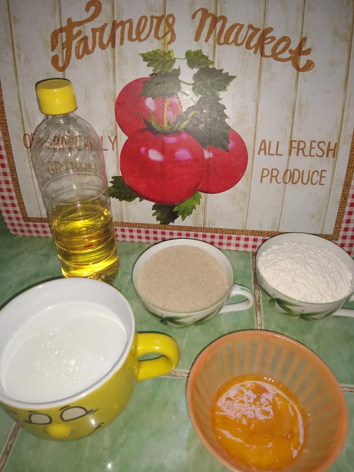 Paso 1 – Los ingredientes: la yema y la clara de un huevo, una taza de harina de trigo, tres cucharadas de azúcar, una taza de leche, una cucharadita de aceite y una pizca de sal.