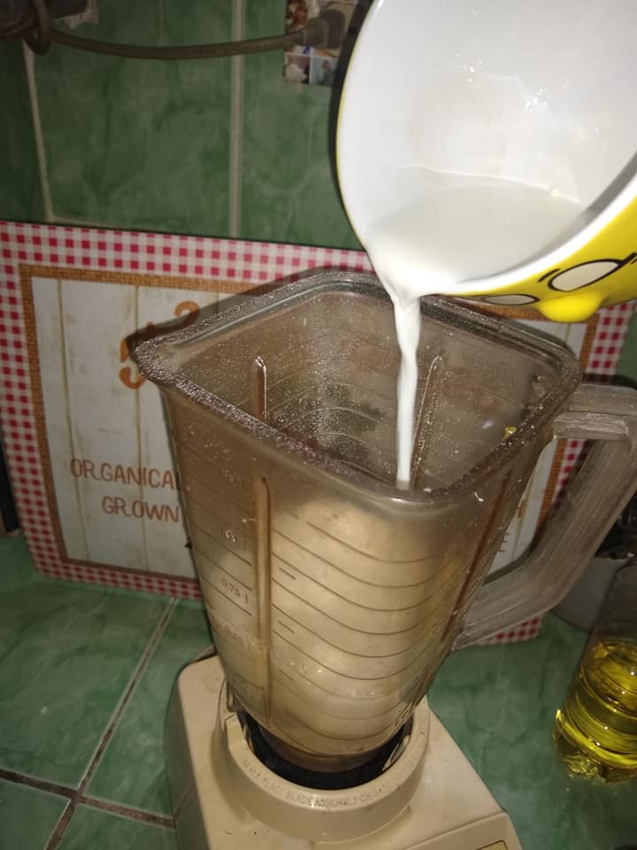 Paso 3 – La eché en la licuadora con la harina, la pizca de sal, las 3 cucharadas de azúcar y media taza de leche. Lo batí todo hasta integrar bien.