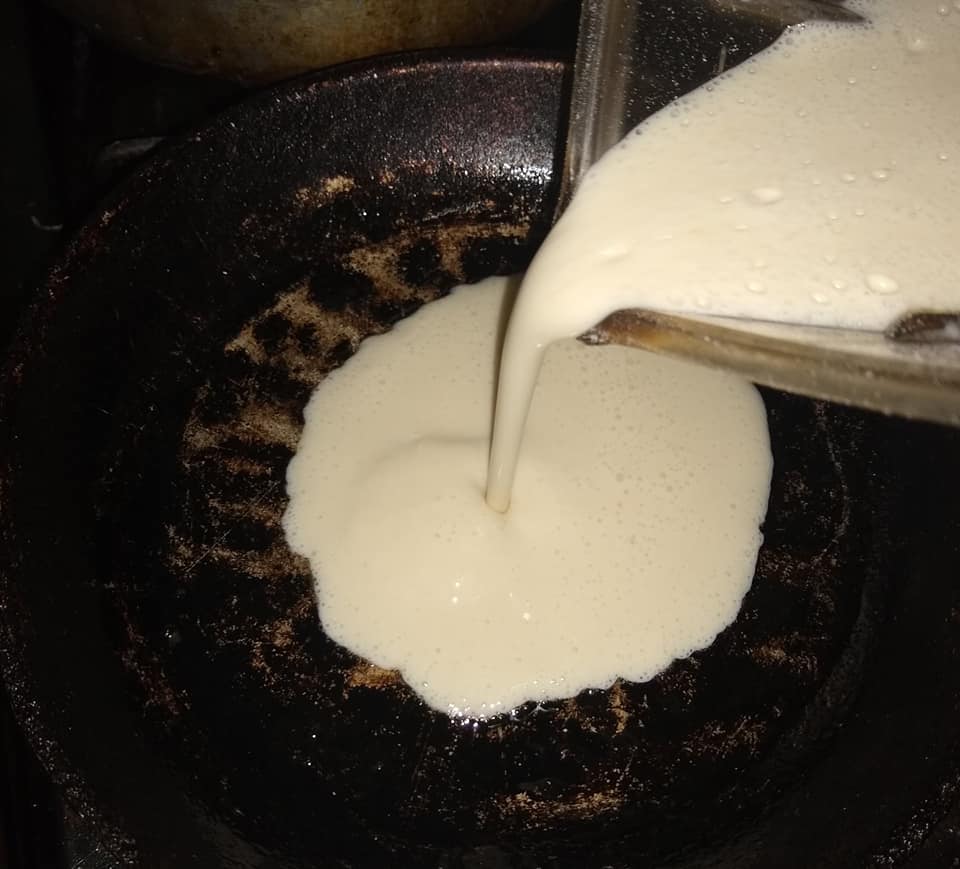 Paso 4 – Luego cliente el sartén y lo embarre con aceite. (Solo es una pizquita de nada) eche un poco de la mezcla directo de la licuadora. Es que casi le tengo cogida la medida. Pero puedes usar un cucharón mediano si lo deseas.