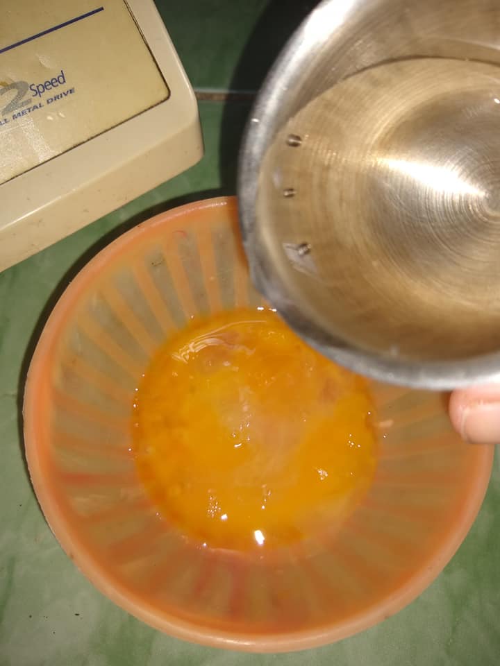 Paso 2 – Lo primero fue agregar un poquito de agua a la yema de huevo porque al estar en el refrigerador se puso dura en la parte de arriba. Así que diluí el agua con la yema de huevo.