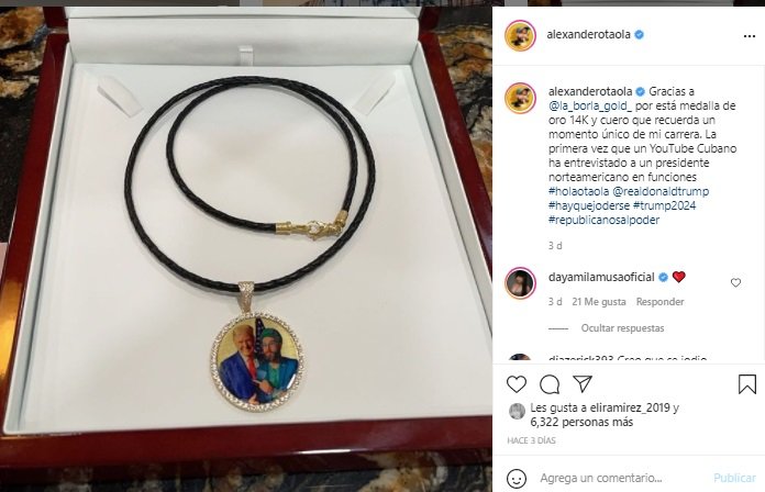 “Gracias a @la_borla_gold_ por esta medalla de oro 14K y cuero que recuerda un momento único de mi carrera. La primera vez que un YouTube Cubano ha entrevistado a un presidente norteamericano en funciones”, mencionó Otaola junto a la imagen del regalo.