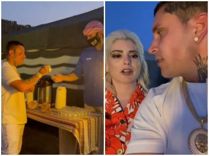 Laura y Osmani se encontraban disfrutando de una noche tradicional en Dubái y el reguetonero se aventuró a probar la leche de camella, que le sirvieron en una pequeña taza, pero no había notado que estaba caliente.