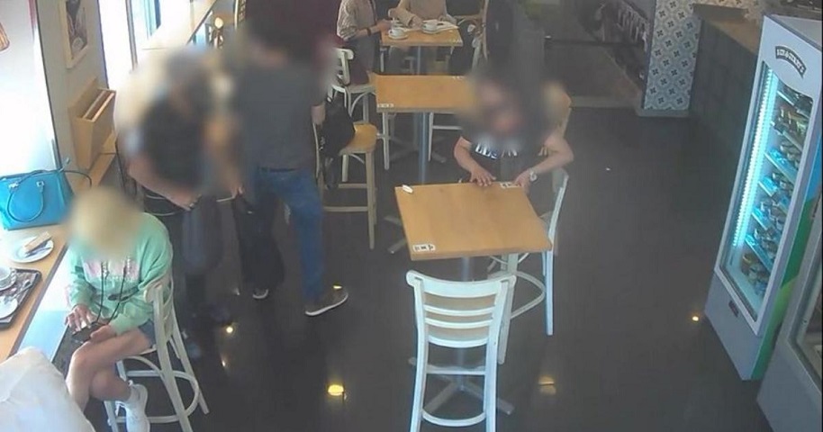 A continuación, la única mujer del grupo se sienta en una silla cercana y simula esperar al camarero para hacer un pedido. Momento en que su compañero se acerca a la joven del teléfono y le roba la mochila. Mientras tanto, el tercer integrante del grupo se coloca de pie y extiende los brazos para quitarse la camisa y así impedir que otros clientes del bar puedan ver lo que está sucediendo.