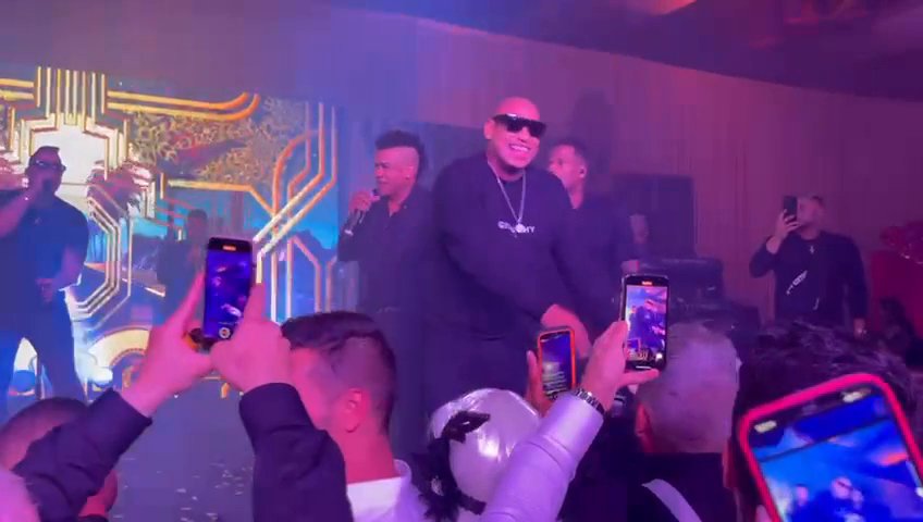 El Monarca subió al escenario junto a Randy Malcom y a El Chulo, quienes cantaron de conjunto el tema “Yo loco por bailar contigo”, durante una presentación en una fiesta privada de la familia Guiribitey en el lujoso Hotel JW Marriott Marquis.
