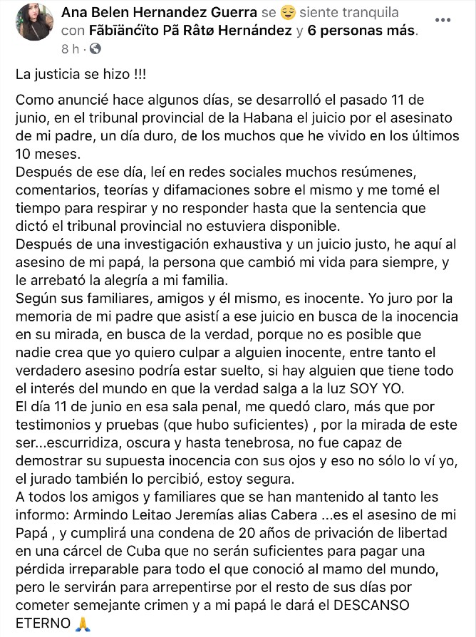 Ana Belén alegó que pasaron 10 meses de «investigación exhaustiva» hasta alcanzar un «juicio justo». Afirmó que ella no quisiera culpar a alguien inocente mientras el verdadero asesino de su padre esté libre, pero que tiene la certeza de que Leitao Jeremías es el responsable del crimen.