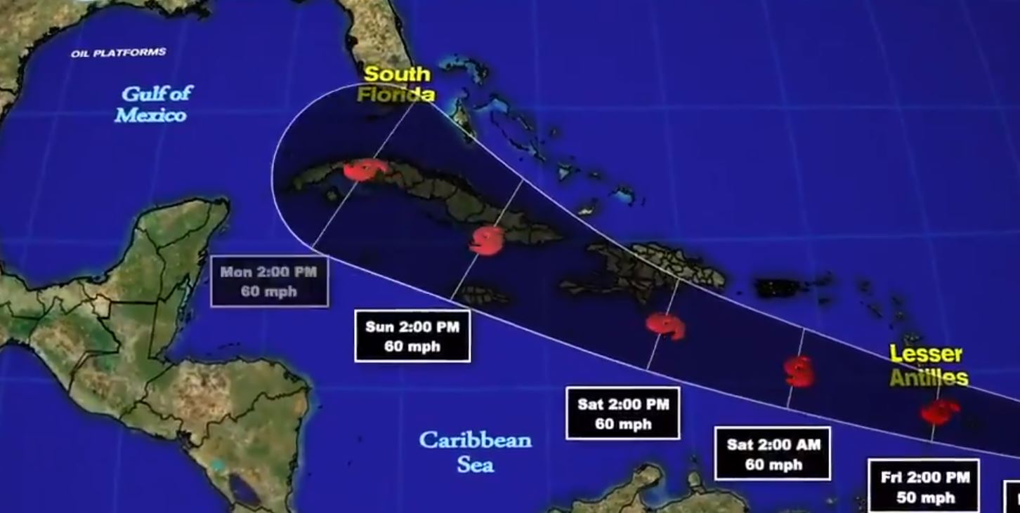 A las cinco de la mañana el centro de esta tormenta tropical se estimó en los 9.4 grados de latitud Norte y los 48.8 grados de longitud Oeste, posición que la sitúa a 1390 kilómetros al este sudeste del Arco de las Antillas Menores. Este organismo se desplaza rápidamente hacia el oeste a 41 kilómetros por hora.