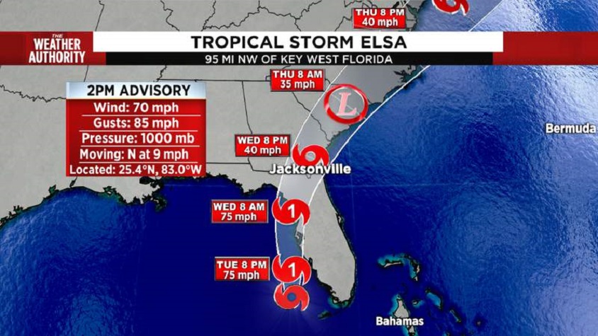 El NHC indicó en su boletín de las 14.00 horas de Miami (18.00 GMT), que Elsa se encontraba a unas 95 millas (150 km) al noroeste de Cayo Hueso y a 180 millas (295 km) al sur de Tampa, en la parte central del litoral occidental de Florida.