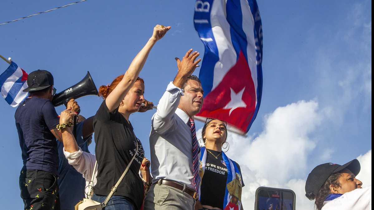 Mientras varios centenares de cubanos exiliados se manifestaban en el emblemático restaurante Versailles (en la Pequeña Habana), incitó a la Policía Nacional y a las Fuerzas Armadas de Cuba a respaldar a su pueblo.