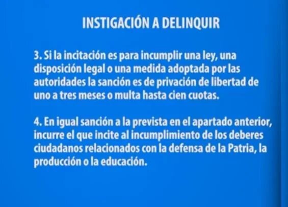 De acuerdo con lo aclarado en un programa especial de la televisión estatal cubana, dedicado a desprestigiar las protestas del último domingo y dirigido por el muy polémico Humberto López, el Ministerio del Interior (MININT) de Cuba puede llegar a procesar a ciudadanos cubanos por gritar «Patria y Vida», por ser considerado este acto como delito de «instigación a delinquir».