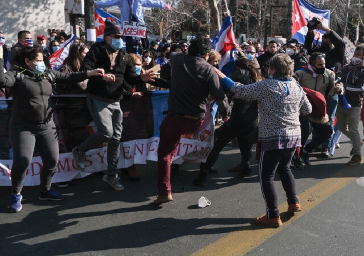 Este viernes, se registraron diversas manifestaciones a las afueras del consulado de Cuba en la capital de Chile. Los protestantes se enfrentaron entre sí, en los que están en contra del gobierno y los que reclamaban por el fin del embargo estadounidense contra la isla.