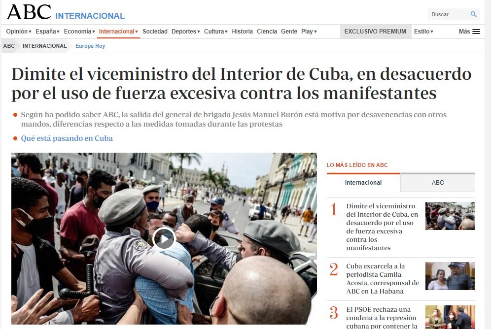 Por su parte, también llegó a ser noticia una información del diario ABC sobre la supuesta dimisión del viceministro del Interior cubano luego de criticar la forma en que las autoridades reprimieron las protestas el 11 de julio. La agencia de noticias AP precisó que esta es una noticia falsa y que los altos mandos permanecen en sus puestos.
