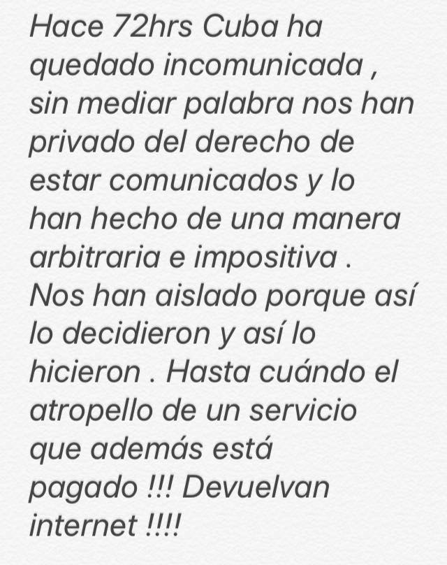 “Hace 72 horas, Cuba ha quedado incomunicada, sin mediar palabra nos han privado del derecho de estar comunicados y lo han hecho de una manera arbitraria e impositiva. Nos han aislado porque así lo decidieron y así lo hicieron. ¿Hasta cuándo el atropello de un servicio que además está pagado? ¡Devuelvan internet!”, sentenció Alvariño.