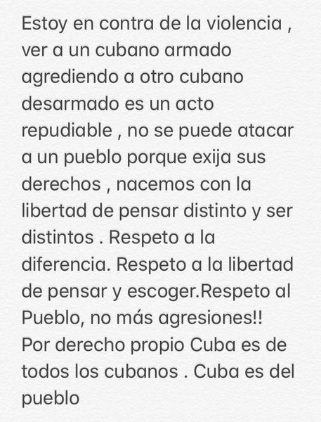 “Estoy en contra de la violencia, ver a un cubano armado agrediendo a otro cubano desarmado es un acto repudiable. No se puede atacar a un pueblo porque exija sus derechos”, comenzó diciendo la actriz en Instagram.