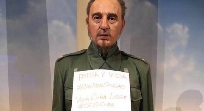 Colocan cartel de “Patria y Vida” sobre la escultura de Fidel Castro del museo de cera en Nueva York (+VIDEO)