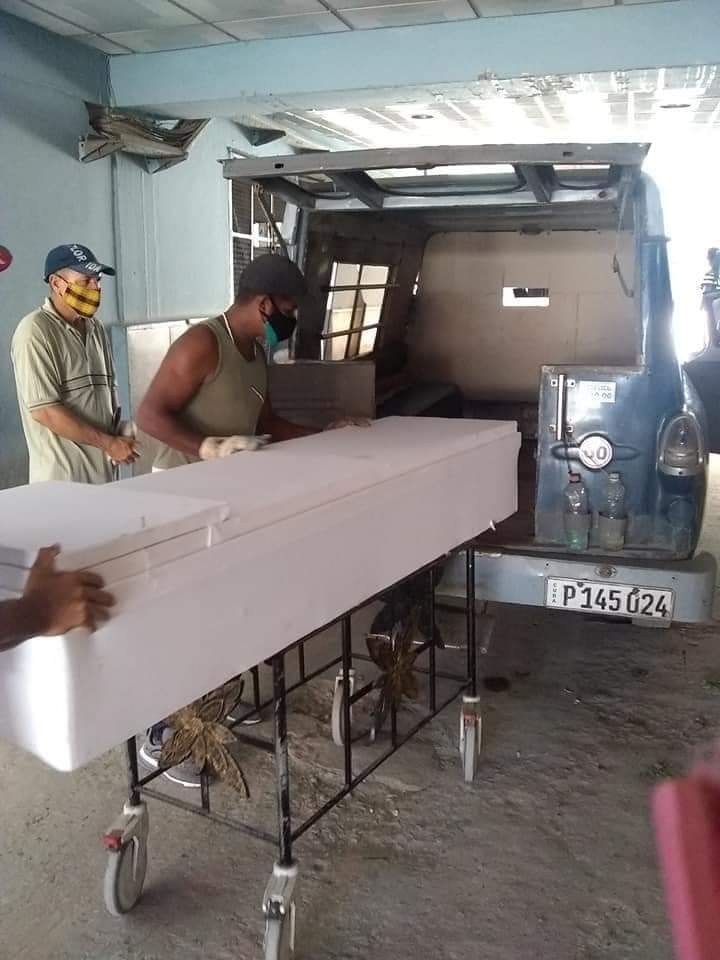 Margarita Luaces, hermana de un difunto por coronavirus en Morón (Ciego de Ávila), aseguró que el ataúd de su familiar era tan frágil que parecía que no iba a llegar íntegro a la tierra; y, de hecho, no lo hizo, pues la armadura de mala madera, con forro de tela blanca, el fondo de un cartón muy fino y sin ornamentos metálicos, se abrió por una esquina cuando comenzó a bajar por la fosa.