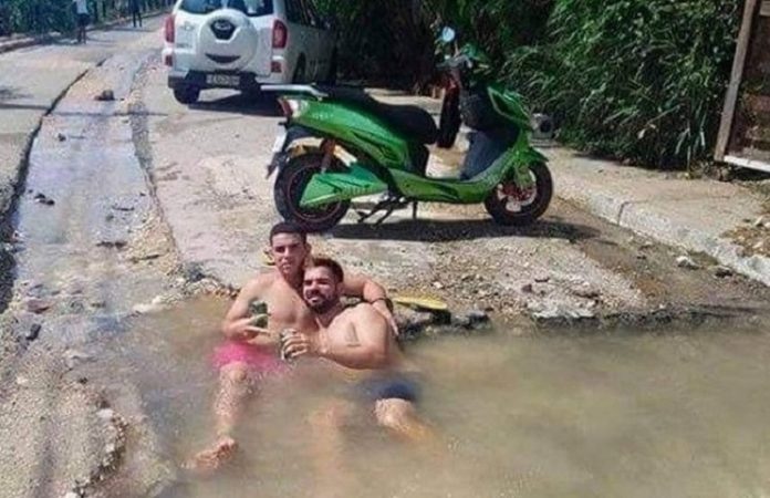 En las últimas horas ha estado circulando en redes sociales una foto en la que se puede ver a dos cubanos disfrutando de un baño en un “jaccuzi natural”, en un bache en una calle de la Isla.