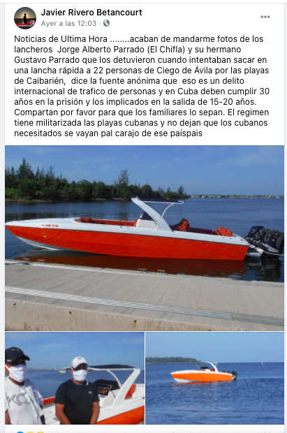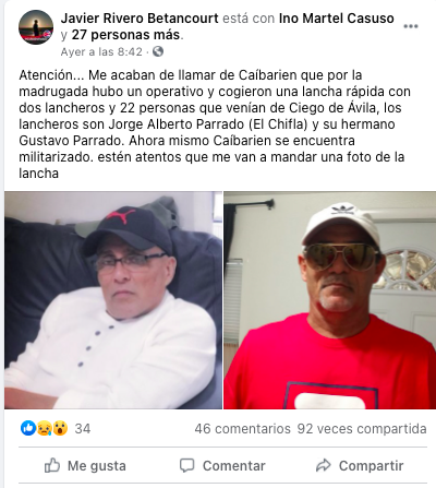 “Me acaban de llamar de Caibarién que por la madrugada hubo un operativo y cogieron una lancha rápida con dos lancheros”, escribió en Facebook el internauta Javier Rivero Betancourt, quien además los identificó como Jorge Alberto Parrado (El Chifla) y el otro como Gustavo Parrado.