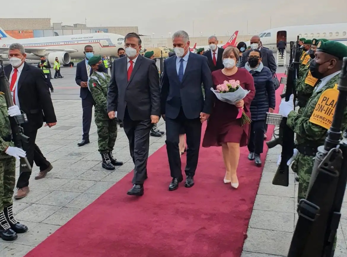 El canciller Marcelo Ebrardal presidente Miguel Díaz-Canel quien llegó acompañado de su esposa Lis Cuesta Peraza y del ministro de relaciones exteriores de Cuba, Bruno Rodrígue.