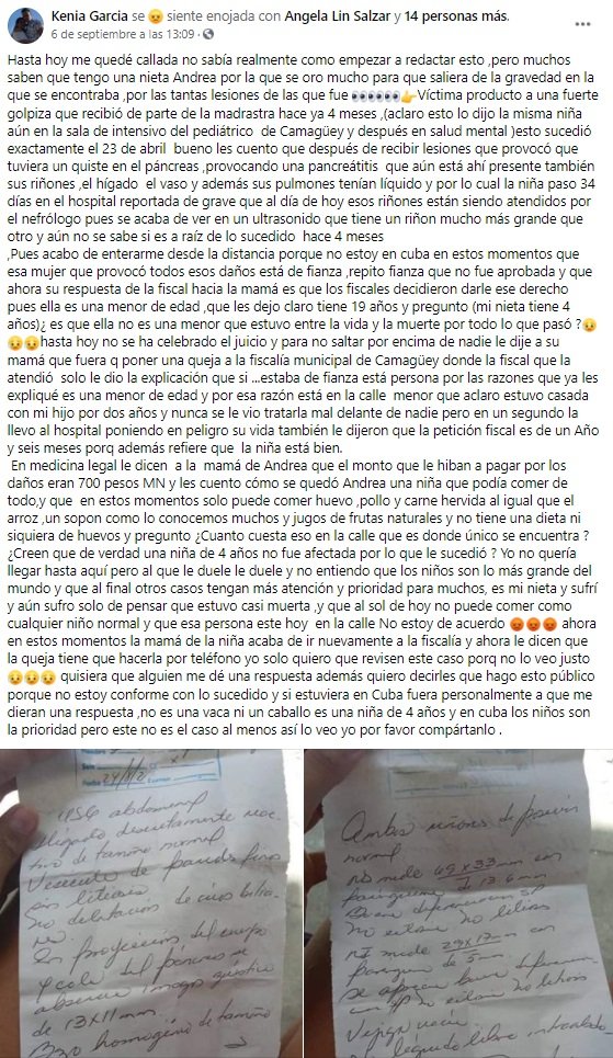 Según la publicación de esta abuela cubana, identificada como Kenia García, la menor fue ingresada en el hospital debido a las lesiones que le provocó su madrastra.