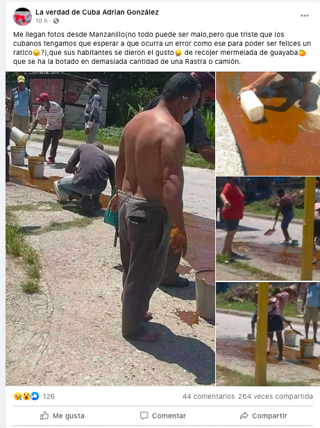 En las últimas horas ha estado circulando en redes sociales las imágenes de varios cubanos recogiendo la mermelada de guayaba derramada en una de las calles de la Isla, lo cual ha causado indignación entre los nacionales de dentro y fuera del país.