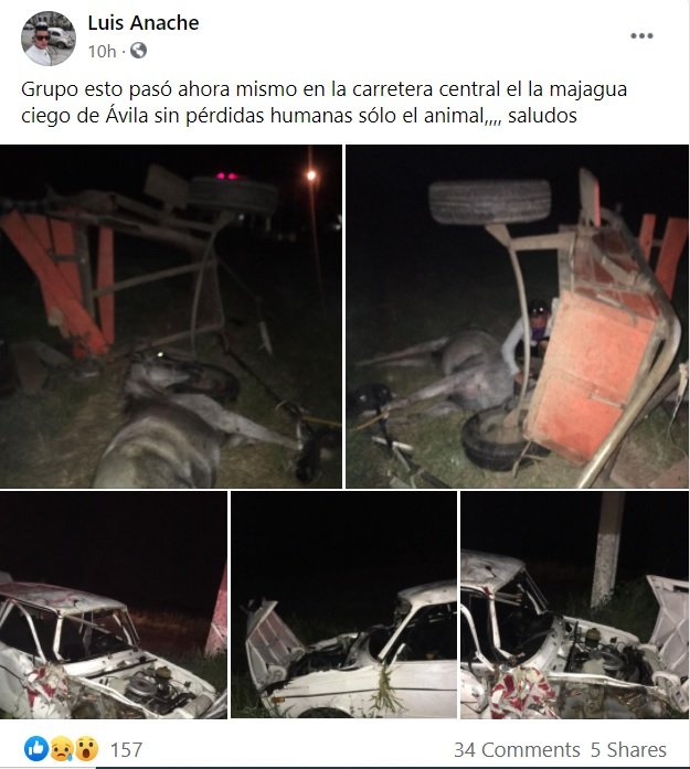 En horas de la noche del sábado, en un tramo perteneciente a Ciego de Ávila, en la Carretera Central de Cuba, un auto lada quedó destrozado al impactar en la oscuridad a un carretón de caballo. El animal murió en el acto.