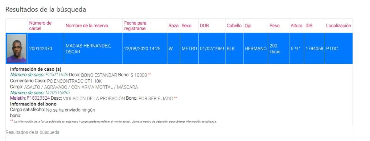 En la ficha policial se puede apreciar que además se le impuso una fianza de 10.000 dólares y se le acusó de un delito grave en segundo grado.