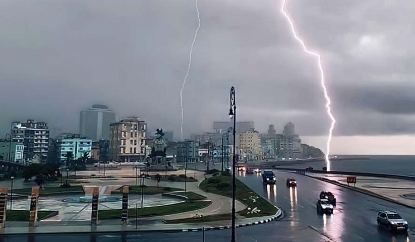 Las extraordinarias fotografías muestran el momento en que el rayo cae en el medio del parque, frente al hospital Hermanos Ameijeiras de Centro Habana.