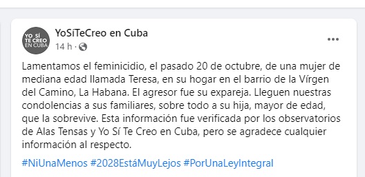 «El agresor fue su expareja. Lleguen nuestras condolencias a sus familiares, sobre todo a su hija, mayor de edad, que la sobrevive. Esta información fue verificada por los observatorios de Alas Tensas y Yo Sí Te Creo en Cuba, pero se agradece cualquier información al respecto”, concluyen.