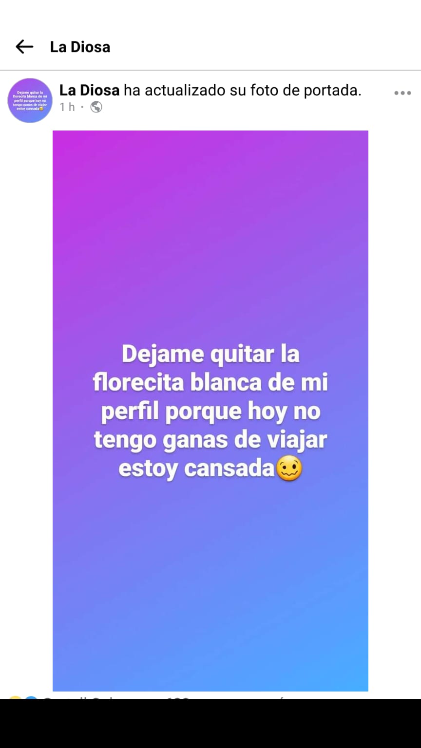 “Déjame quitar la florecita blanca de mi perfil, porque hoy no tengo ganas de viajar, estoy cansada”, expresó La Diosa en una publicación en redes sociales. Para destacar la ironía, utilizó en su mensaje un emoticón que sugiere “mareo”.