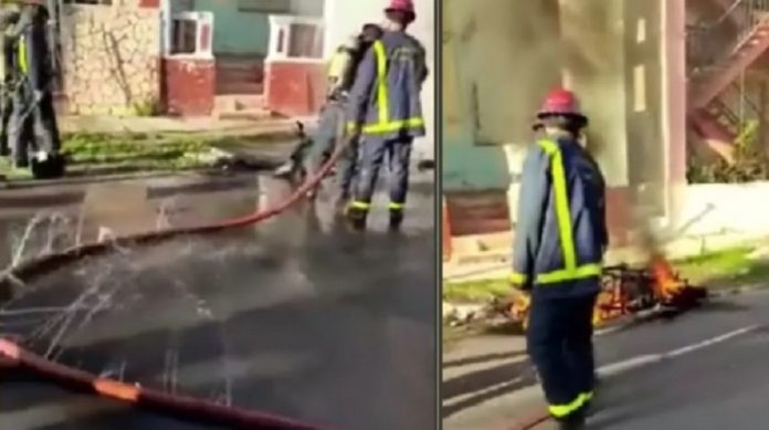 En las últimas horas ha estado circulando en redes sociales un video en el que se ve como unos bomberos cubanos sofocan las llamas ocasionadas por la explosión de una moto eléctrica. Curiosamente, el material no se ha vuelto viral por las causas habituales.