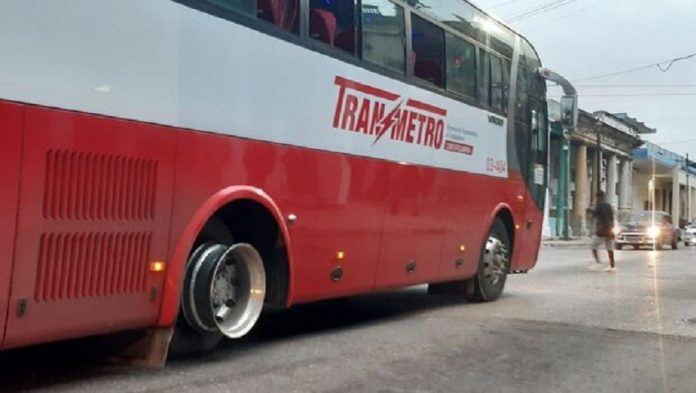 En horas de la tarde de este lunes, un ómnibus de la marca Yutong que transportaba de regreso a casa a algunos trabajadores de los laboratorios AICA circulaba por la calzada del Cerro despertando murmullos entre varios transeúntes que no alcanzaban a creer que faltaba uno de los neumáticos traseros.